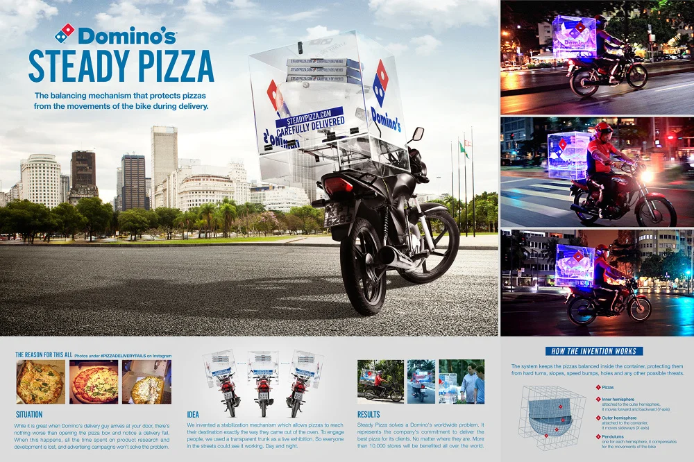 Steady Pizza Case Study 27 Jan Written By Dani Comar Balancing pizzas delivery and social media complains with an interesting stabilizing mechanism. View fullsize deliveryshoppersocial mediaoutdoorexperientialartplanbrazillatinadomino’s pizzaqsraward-winningdesigninnovation Dani Comar Creative Consultant and Workshop Facilitator http://activationideas.com